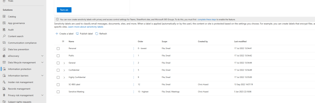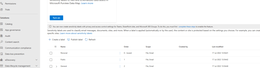 Ok. Now the licence is assigned to the user we can go ahead and create our Sensitivity Label for a Private Meeting. There is differences for a Channel Meeting that will be covered later in the blog.
