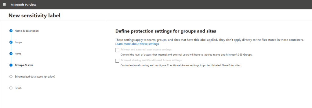 11.) Next is the Groups and Sites page. If this were a Sensitivity Label for a Channel Meeting this would be configured here but since we are doing a label for private meetings we don’t need to worry about this section and we can simply select Next