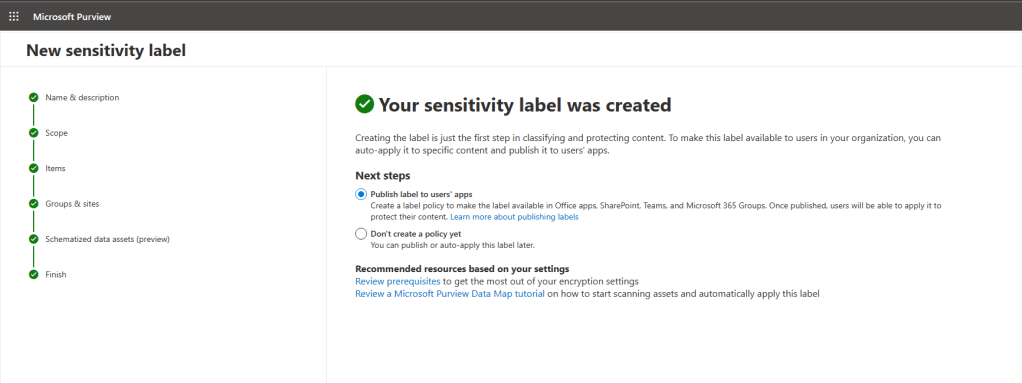14.) The label is created. But we now have to create the label policy and apply it to those with Teams Premium Licences. Select Publish Label to Users Apps and then Done