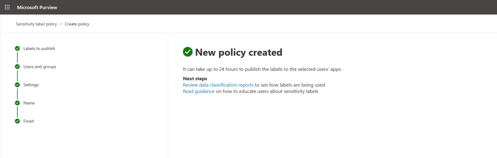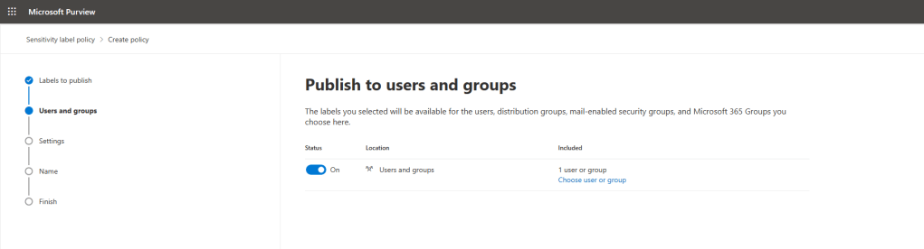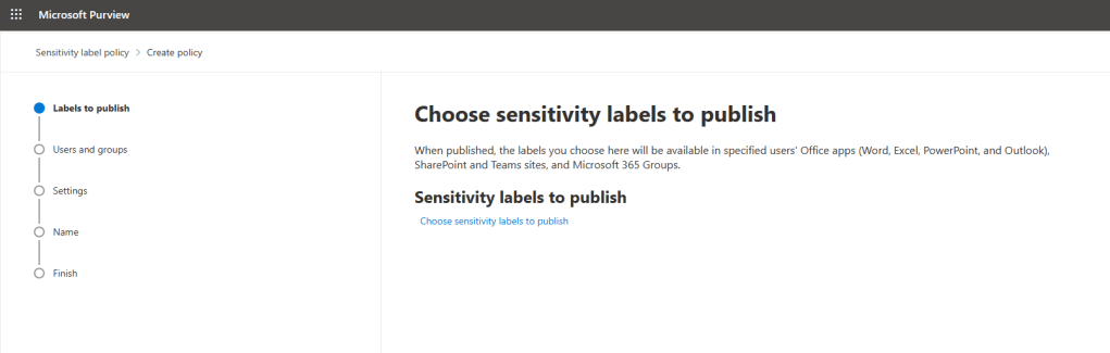 15.) Select Choose Sensitivity Labels to Publish, add the label just created and select Next