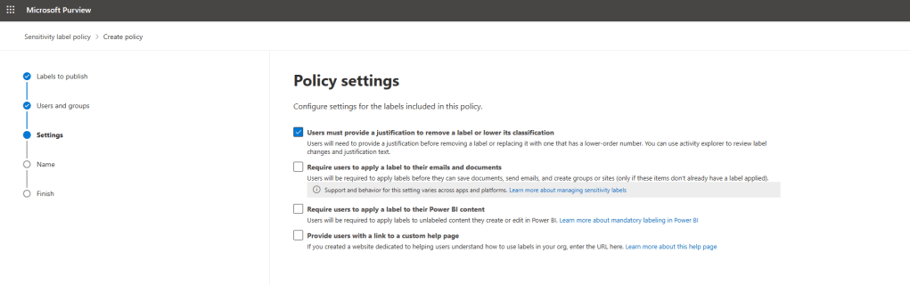 17.) Configure the policy settings and select Next. The only one used for this example will be to provide a business justification if the sensitivity label has been removed. Important Note: this justification upon removal isn’t supported today (See FAQ) and won’t work but if the functionality were supported I would want the label to have this.