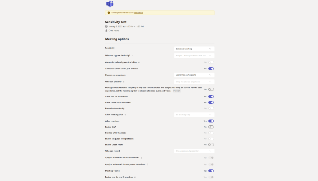 The outcome of adding a sensitivity label to a meeting template is that the settings of the Sensitivity Label take precedence. Some people may wonder why would we use these two together? Because whilst each can cover certain meeting options, they both have slightly different scopes. Together we can aggregate it all. For example, Sensitivity Labels control copy protection, whilst Templates control camera and audio of participants. Both cover Watermarking and E2EE but Sensitivity Label overrides. By using a sensitivity label we are using something that can be used over many different meeting templates, but with templates we are making it easy for users to protect data based on Meeting Type rather than on Labels which can be an abstract concept to them.