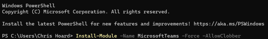 Install-Module -Name MicrosoftTeams -Force -AllowClobber
