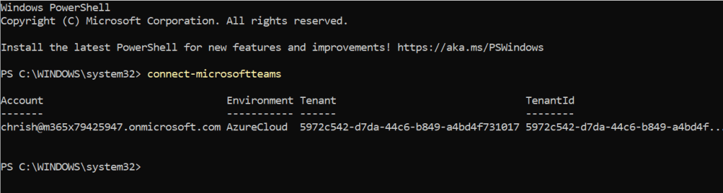 3.) Connect to Microsoft Teams using the command below. You may need to authenticate
