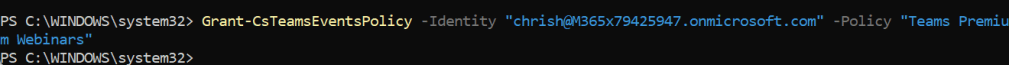 Grant-CsTeamsEventsPolicy -Identity "[UPN]" -Policy "Teams Premium Webinars"