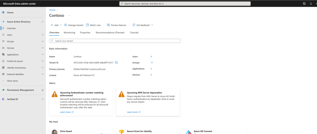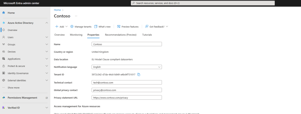 2.) The next experience will take you to Microsoft Entra. From Overview, Select the tab Properties