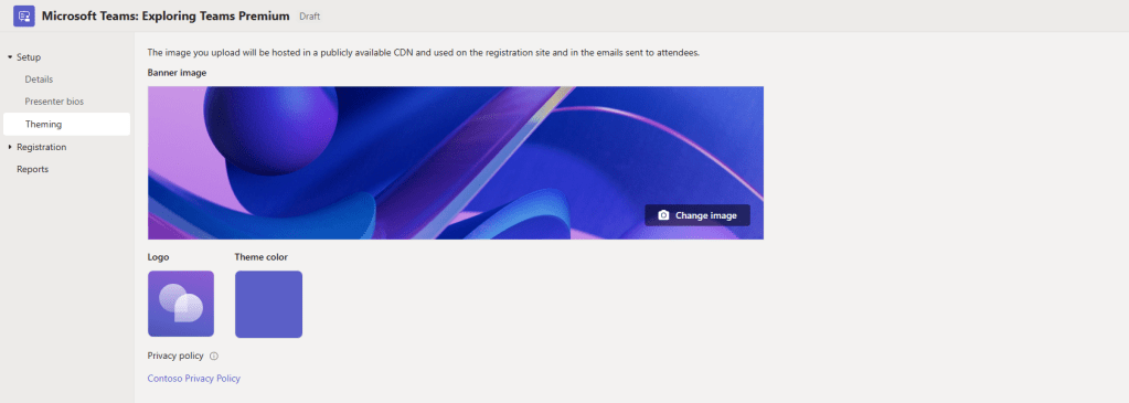 5.) Next, to configure the Theming of the Webinar. Here you can set the image on the webinar registration page, the logo, and the theme colour. Here, you will also notice the Privacy Policy as set by the Privacy Statement URL in Azure AD.