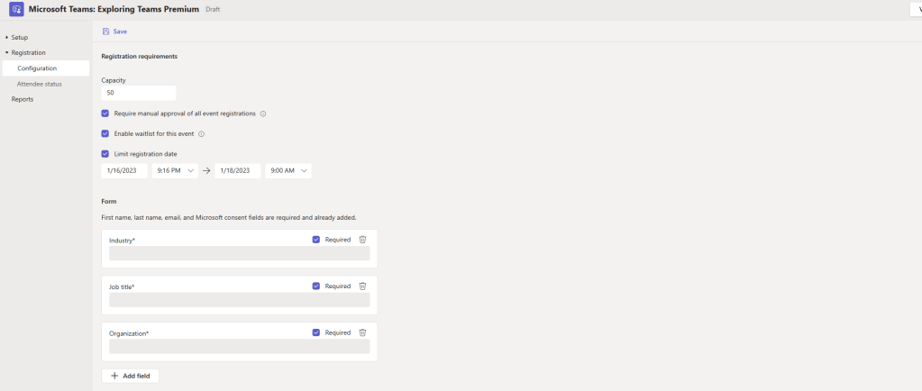 Here are some screenshots proving it with an example. I create a meeting with a custom meeting template that includes a sensitivity label, watermarking, E2EE – all the things I created in previous blogs, and then I add meeting registration on top of the meeting. That is effectively a webinar prior to the new Teams Premium webinar features. However, in this scenario whilst I get the advanced meeting security features of Teams Premium I do not get the advanced management features such as waitlist, manual approval and limiting the window to register through the new setup process.