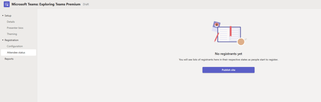 7.) Initially, Attendee status and reports are empty. Before I go ahead and publish the site (the registration page) I am going to return to the Details Section