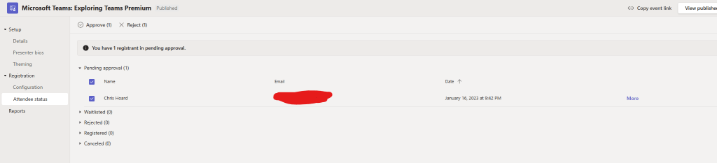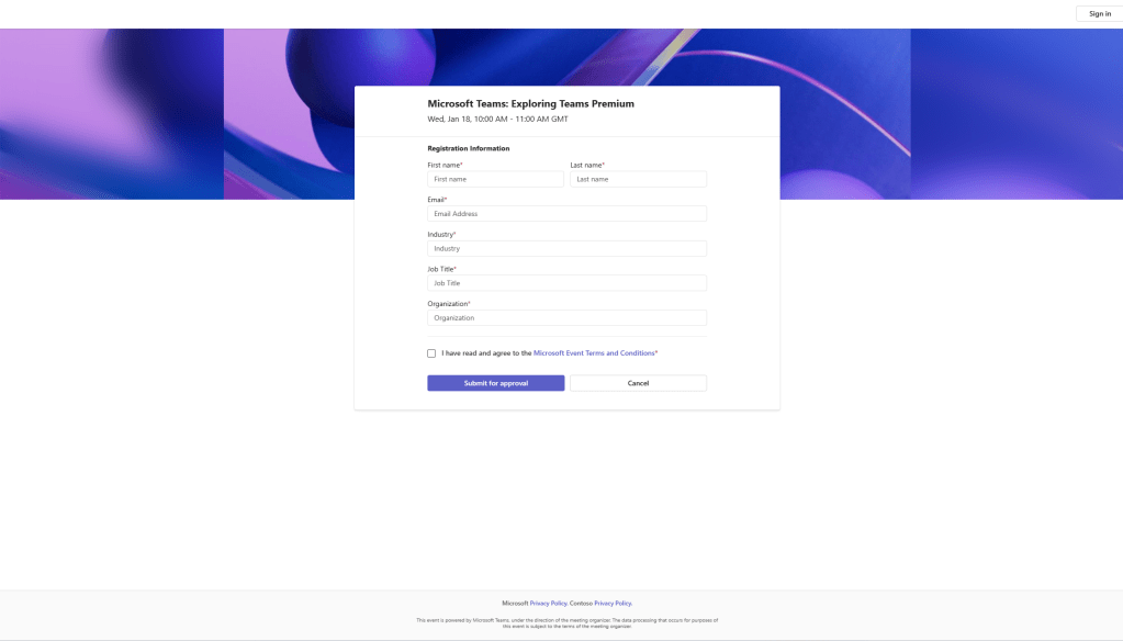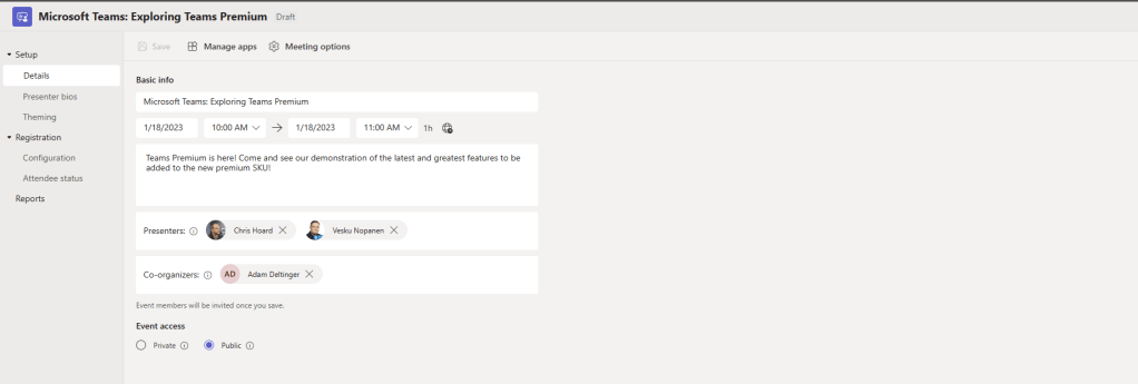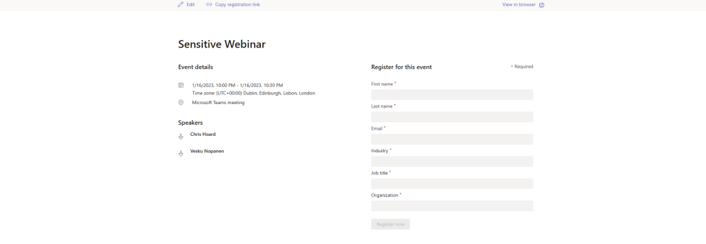 Last week, we managed to do a lot on the new security features included within Teams Premium – Watermarking, End to End Encryption, Custom Meeting Templates and then onto the culmination which was Sensitivity Labels. This week, we are going to change tack and discuss the new Webinar functionalities within the new Webinar setup experience. There is a lot. This includes creating a Webinar waiting list, manually approving registrants, presenter bios and limiting the time and day people can register. Most of these functionalities are within the flow of the new setup experience, however, there are some other things which may not be top of mind – at least from an administrative perspective. So let’s spin through a setup end to end to look at the new functionalities, and this will also tack on implementing a custom event policy in PowerShell (optional) as well as adding the privacy statement in Azure AD (also optional). Of course, I would love at this point to be able to tell you that we can go ahead and simply apply all the nice security features we covered last week to webinars created via the new experience. Unfortunately, this isn’t the case. At least not at the time of writing. No watermarking, no E2EE, no Sensitivity Labels, not even custom meeting templates. But, on the positive side we can see where the direction is going – all of these new security features will hopefully come into the new webinar experience at a later date, and in the meantime, as I will explain later in the blog, we can still leverage the functionalities via classic webinars which is how most will create webinars when they don’t have Teams Premium, and which is still available to Teams Premium users