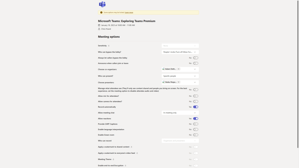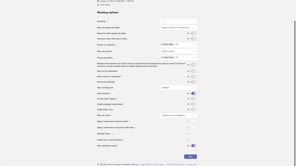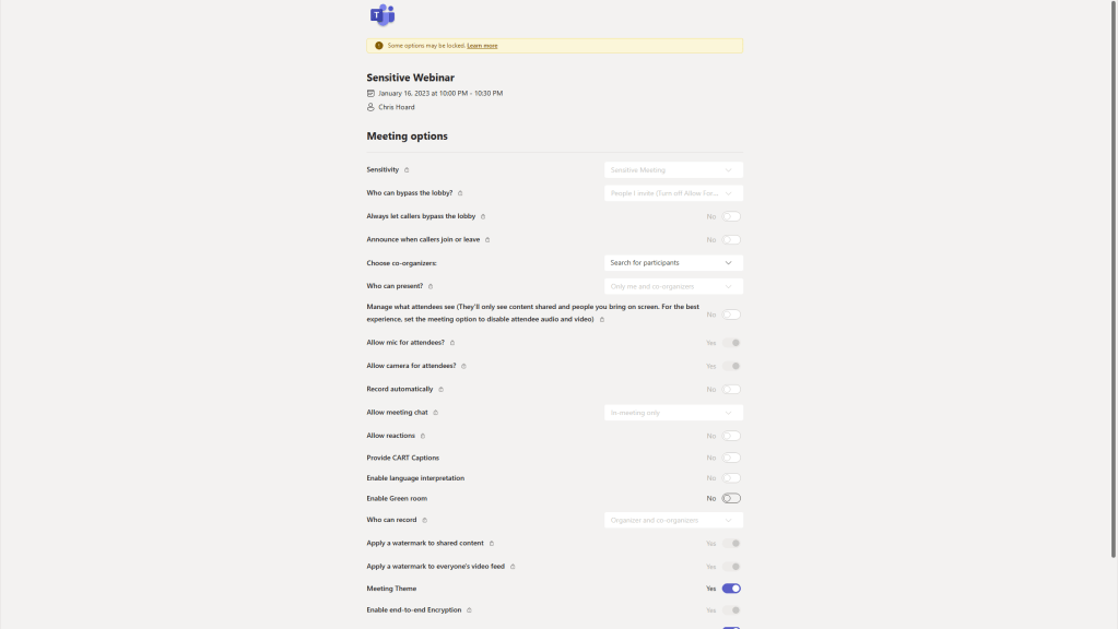9.) At the time of writing meeting options for webinars created through the new experience have many options locked: sensitivity labels are not available/supported, nor is E2EE, nor is watermarking, nor is meeting theme. Meeting templates are not supported for webinars created through the new experience, but the fact they are locked suggests that they are controlled by some hidden template that isn’t available today through the TAC or via PowerShell. Lobby is set by default to invite and recording is set by default to automatic. In this example I will amend some of these meeting options which are available to change manually and select Save. Here are shots of the new webinar defaults out of the box and once I modified them.