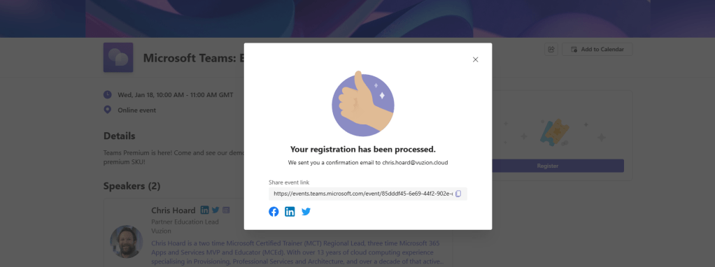 Job done. This webinar is all set up. The registration page is online and open to all. People are registering and the meeting options are configured. All easy to do and intuitive through a new setup experience, with great management features such as capacity, manual approval and limiting the registration date.