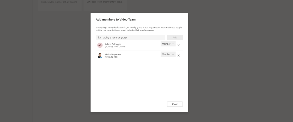 6.) Add Members or Owners to the Team and select Close