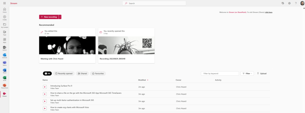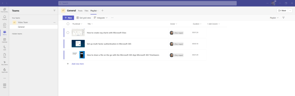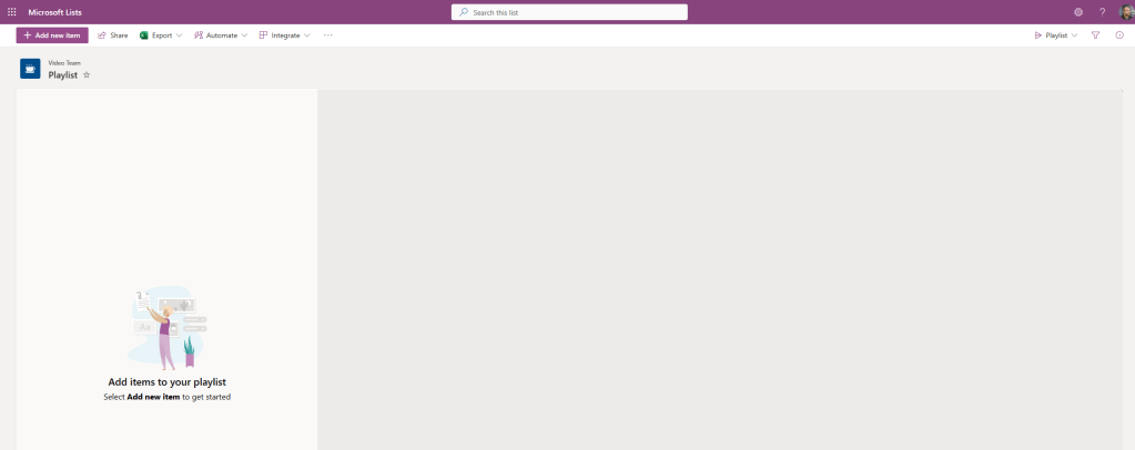 Not much time to shoot the breeze this evening. I’m still in the thick of it. And with the MCT Connect Conference, MWCP and a whole load coming into focus like a tidal wave next month, it’s going to be wild. The word bedlam springs to mind. Nevertheless, one of the things I wanted to write about, and then completely forgotten about, and then remembered as I raked over the coals in the tenant has been the new Lists template for video playlists. You see, I did write about a way to do playlists back in june last year. To me, that seems like a few weeks ago. But Microsoft now have something out of the box. And so I am going to deploy it, and populate it, and then I am going to stick that in a tab and a personal app. Now prior to this – full transparency – I haven’t tried this out previously. I haven’t even attempted it given what I got spinning on the plate, so this will be a pretty functional off the cuff affair.