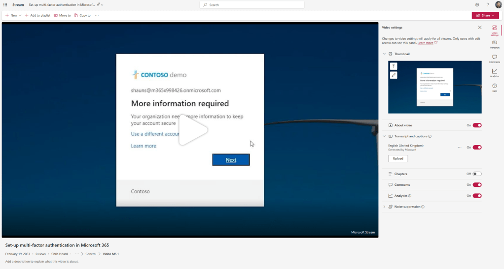 2.) Select each video and make sure it has Thumbnail and add anything needed such as a Description and Captions. This is not just for the playlist but to ensure a great experience for viewers wherever in Microsoft 365 they are viewing the content