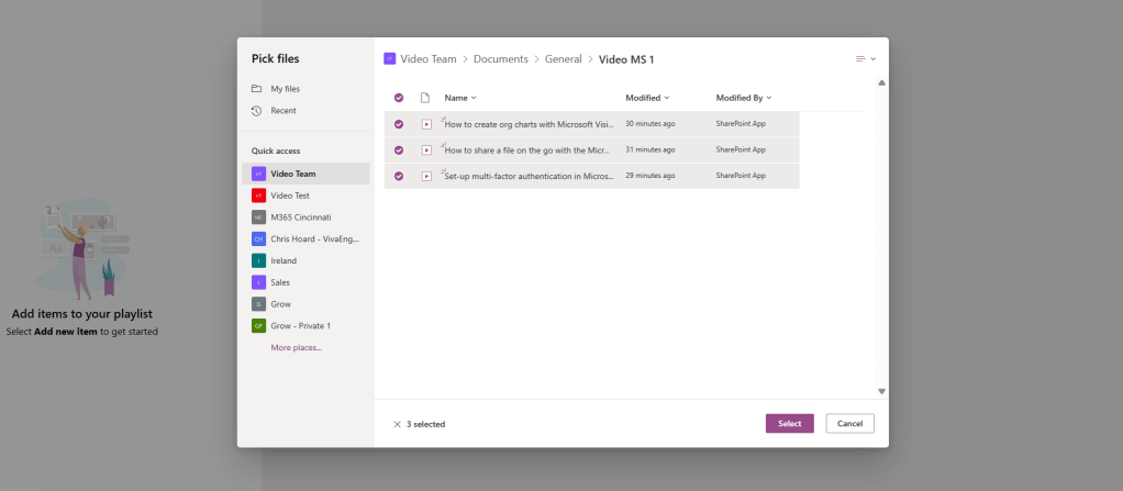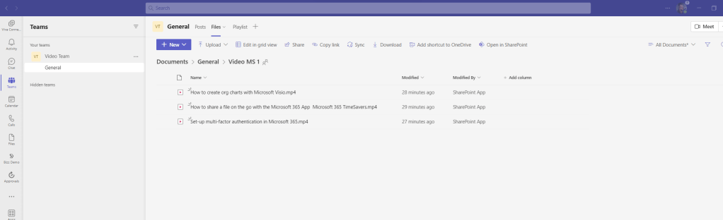 Now the team, SharePoint site and list have been created we essentially have everything apart from the content. We now need to seed the underlying SharePoint site with some video.