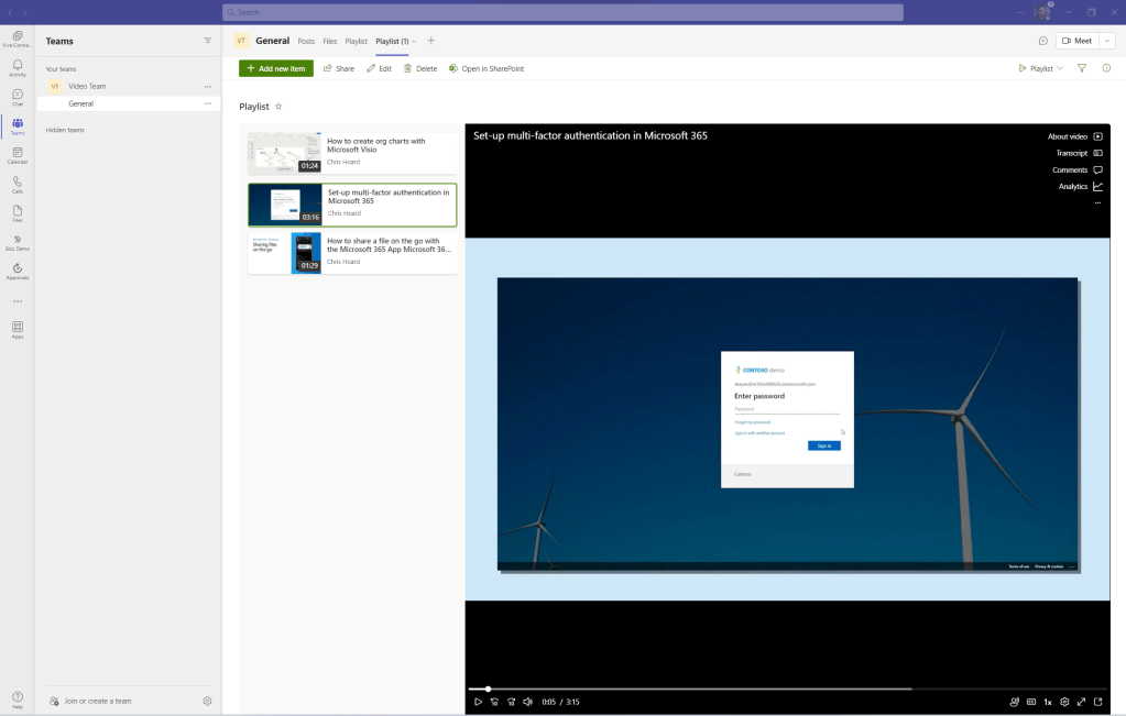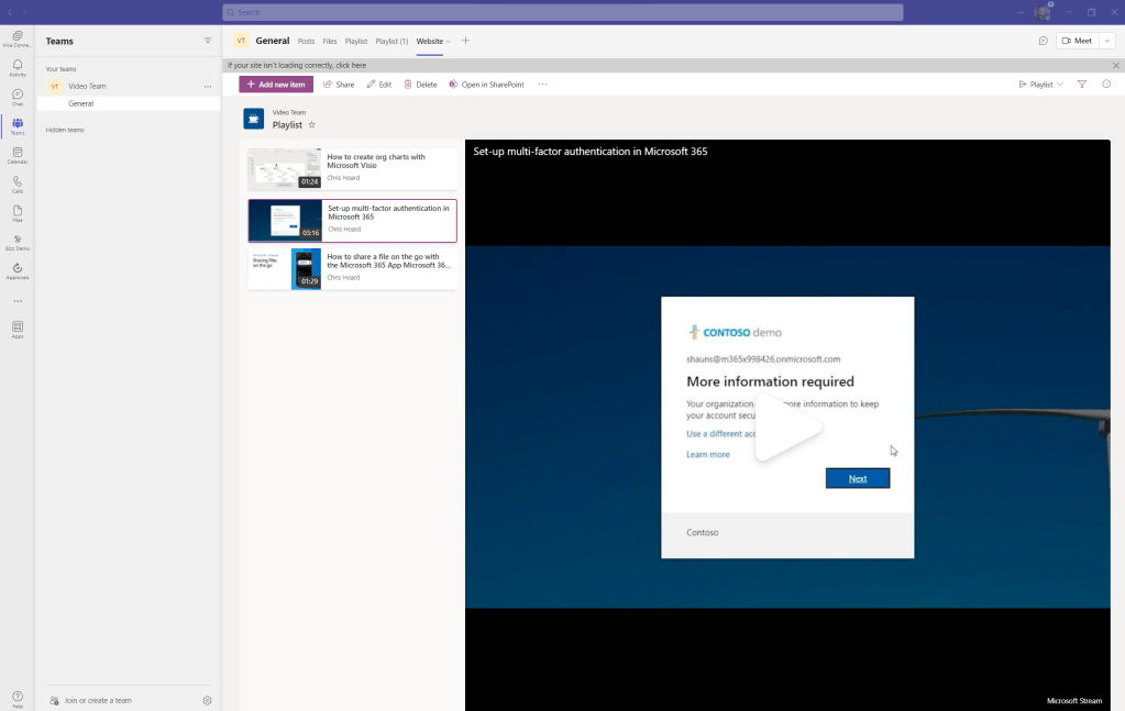 Content URL: https://m365x79425947.sharepoint.com/_layouts/15/teamslogon.aspx?SPFX=true&dest=/sites/VideoTeam/Lists/Playlist