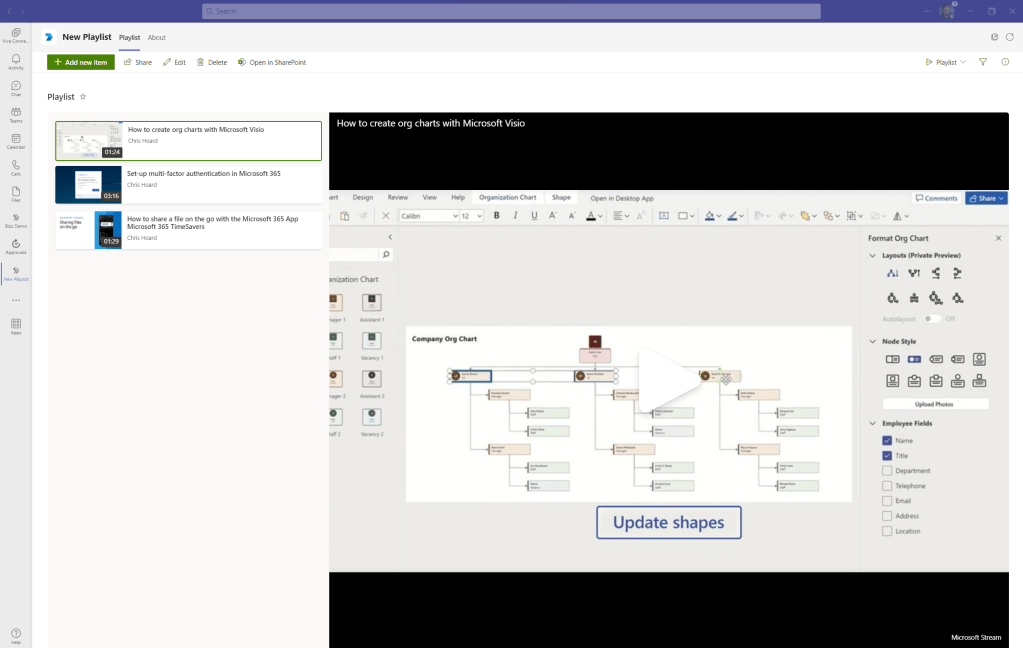 So we managed to get the new playlist experience in as a tab and a personal app. This is awesome. I can use it for demos or for video I may want to keep in the pocket until later. In this one, I only had 2 hours to get everything done end to end – including getting the video, so I didn’t get too granular and much remains to be explored around what’s shown here. But this is a great start, and a great way to get video into the organisation where users are working – and because it’s using the new Stream player, that’s going to be a great experience.