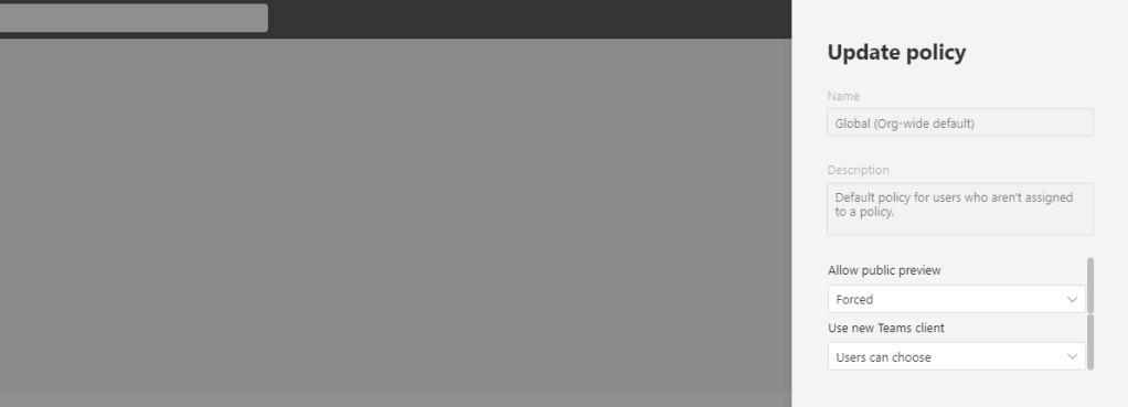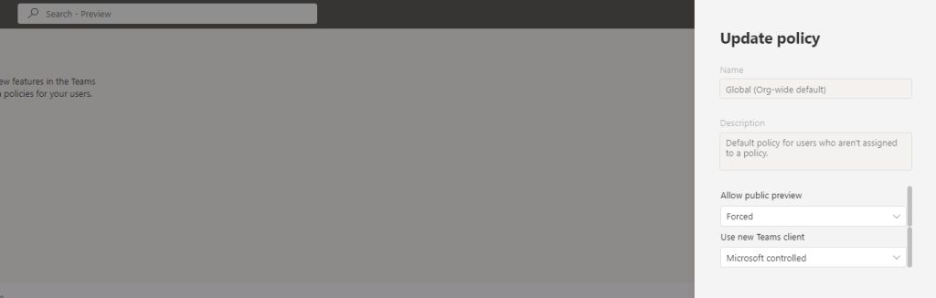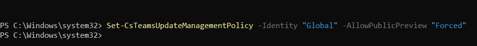Set-CsTeamsUpdateManagementPolicy -Identity "Global" -AllowPublicPreview "Forced"