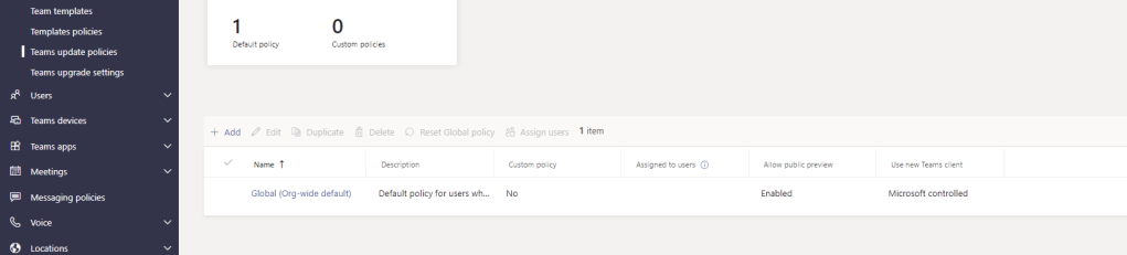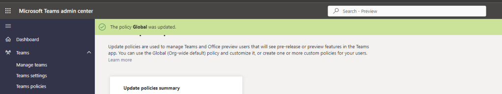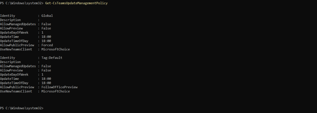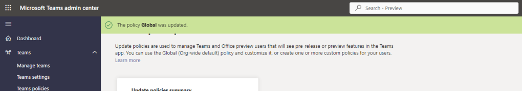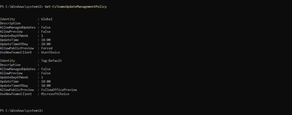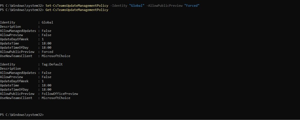 To note, that if you have custom policies that control public preview for users, these would be changed as opposed to the global org-wide default policy as shown here. Custom policies take policy precedence over the global. In order to change a user from the global policy to a custom policy you can use the Grant-CsTeamsUpdateManagementPolicy command