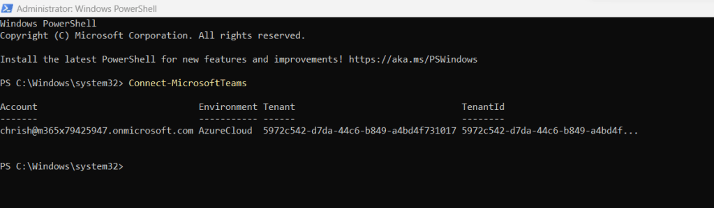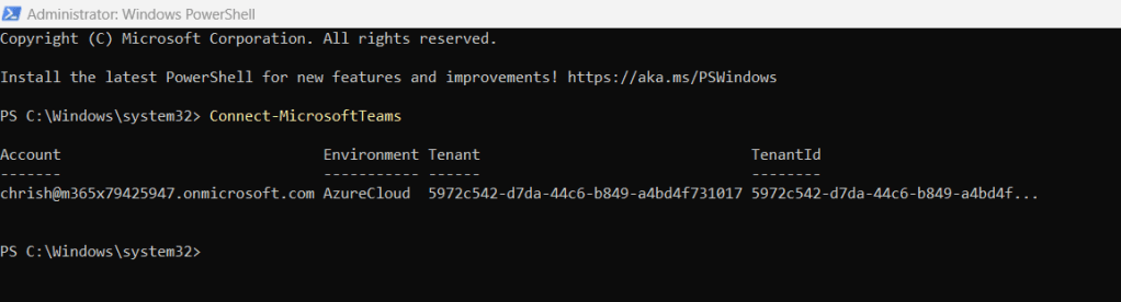1.) Run Windows PowerShell as admin. Connect with Connect-MicrosoftTeams and authenticate as an admin