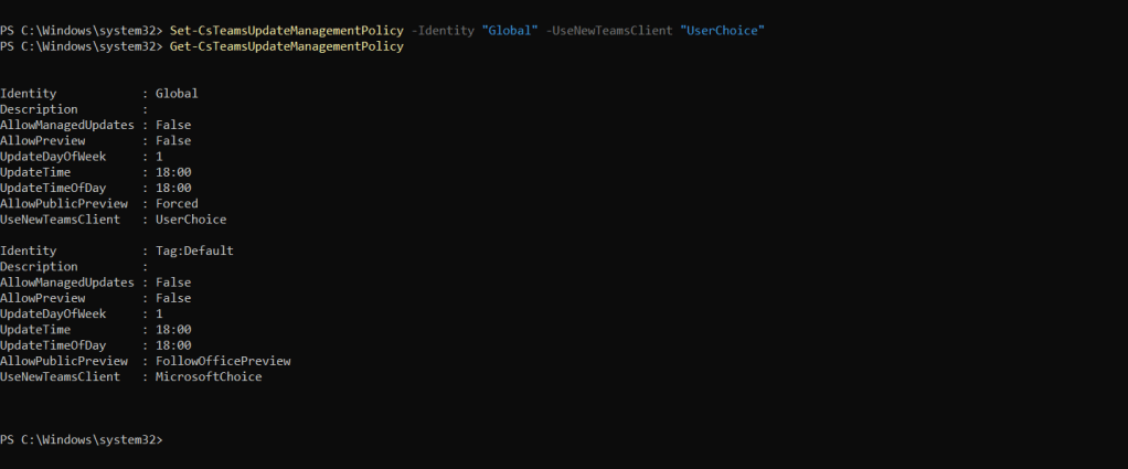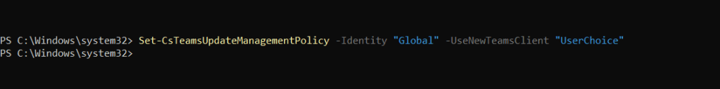 Set-CsTeamsUpdateManagementPolicy -Identity "Global" -UseNewTeamsClient "UserChoice"