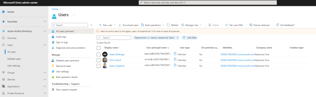 Before we can apply the adaptive scope, or the communuications compliance policy for Teams, we need to ensure the properties of the users in Azure AD are correct. For this scenario, we are going to apply a communication compliance policy to all the Senior Leadership Team (SLT) within the organisation so in Azure AD terms, we need to ensure that the properties of Department in Azure AD for these users are correct