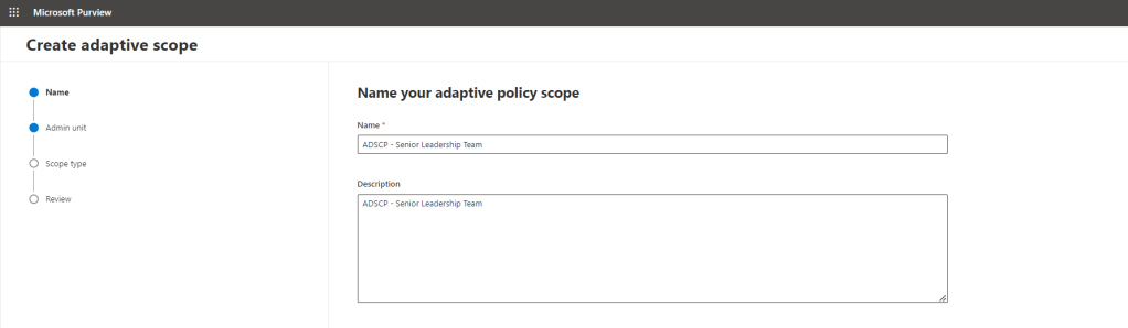 4.) Give the adaptive scope a Name and Description (Here called ADSCP – Senior Leadership Team) and select Next