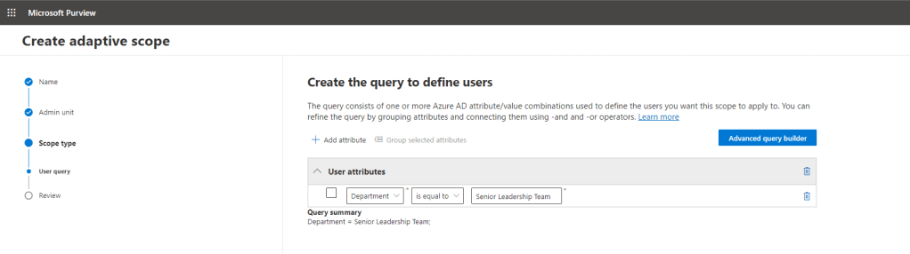 7.) Now set the Adaptive Scope Query. In this example scenario, the Communication Compliance Policy will be applied against everyone who is within the Senior Leadership Team of the org, and so against everyone who has been set as that within the Department property of their user in Azure AD. As shown below Department == Senior Leadership Team which as set in previous steps will include Chris, Vesku and Adam. One the query has been built as intended, select Next