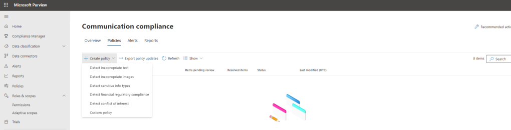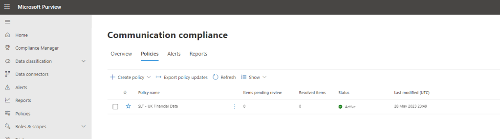 Azure AD is done. The Adaptive Scope with a User Scope Type has been created.So it is now time to create the adaptive Communication Compliance policy