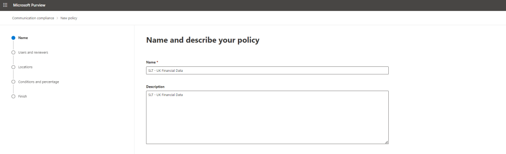 4.) Add a Name and Description of the policy and select Next. This example is called SLT – UK Financial Data