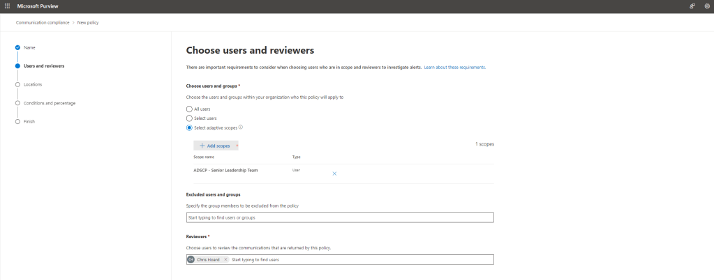 The example provided has been to implement a User Scope Type – and as said previously when it comes to Teams and Communication Compliance this pertains to 1:1 and Group private chats. Should this need to be used within Teams or Channel communications, then a Microsoft 365 Group Scope Type is used and this is set when creating the Adaptive Scope and when building the Custom Communication Compliance Policy.
