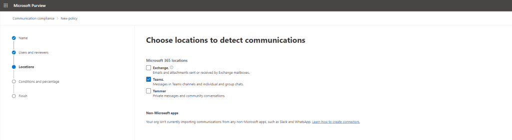 6.) Add locations to detect and select Next. This example will apply to just Teams, and because of the User Scope Type will only cover 1:1 and Group private chat messages.