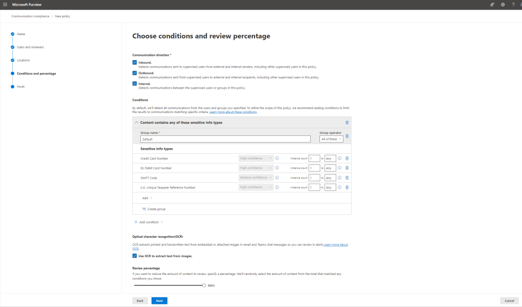 7.) Now set the Conditions and select Next. This example has added and shows UK Financial Sensitive Information types which will be picked up on inbound, outbound and internal communications, with 100% review percentage