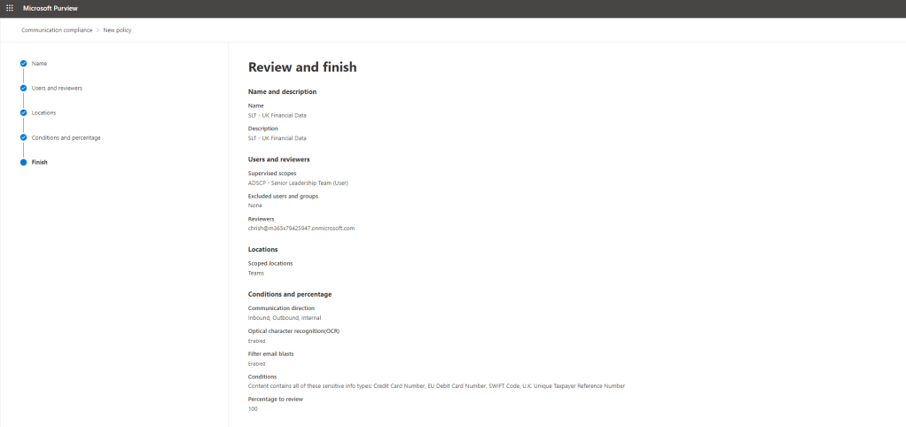 Azure AD is configured. The adaptive scope built. The Communication Compliance Policy is built and is running. Now when an SLT member of the org drops a Financial SIT into a 1:1 or Group private chat message such as a credit card number, a debit card number or a Swift Code, it’ll be flagged and the team can review and take action on it in Communication Compliance