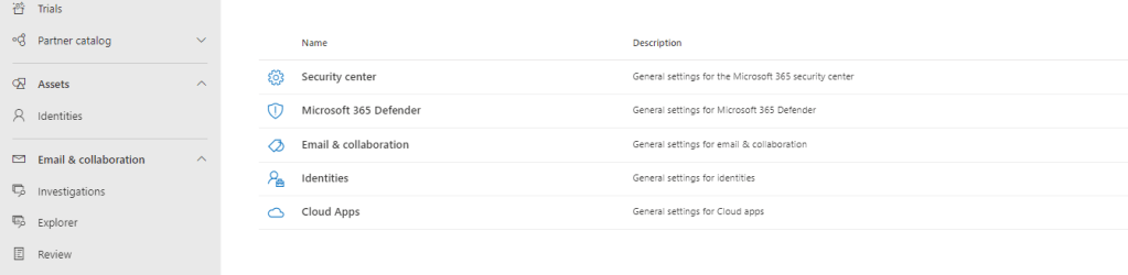 4.) In the Microsoft 365 Defender Portal select Settings in the left navigation
