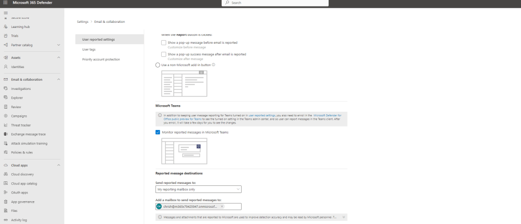 Now that preview is enabled, we need to ensure that End User Reporting is enabled in the Microsoft 365 Defender Portal