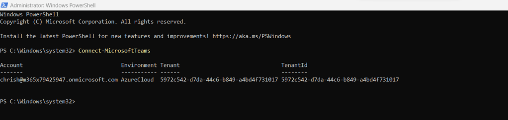 4.) If you want to achieve this via PowerShell, connect to Teams with