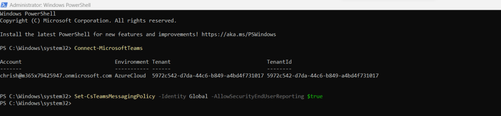 The first step to using end user reporting of suspicious messages in Teams is to enable CSMT. CSMT cannot be enabled in the Microsoft 365 Admin Centre at the time of writing – it is in preview – so it needs to be enabled via PowerShell, and enabling it raises the tenant to be onboarded with Microsoft so to set expectations enabling it may not be immediate. Also to note that whilst one may assume that this operation is executed with the Teams PowerShell Module, it is actually executed using the Exchange Online PowerShell Module. However, once the service goes GA this first step will not be needed.