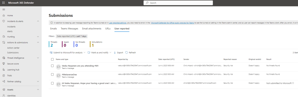 Finally we need to find the reported message in the Microsoft 365 Defender Portal