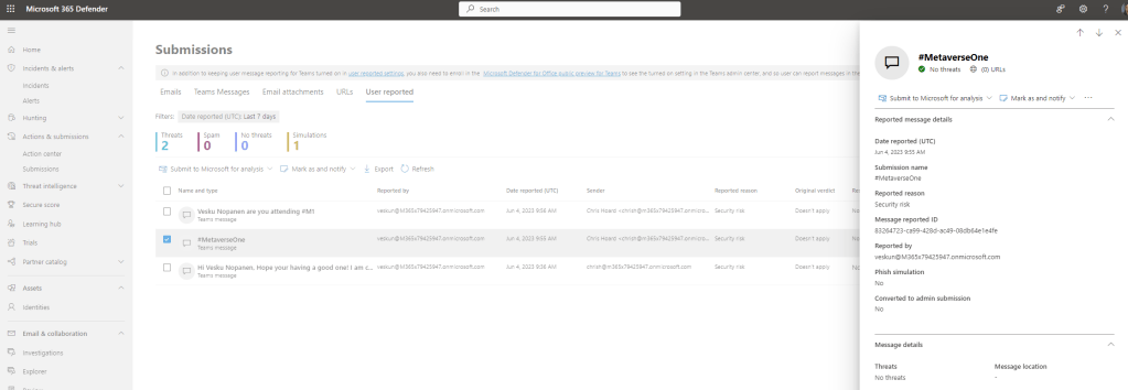 My memory is a little hazy as I approach my 40th year on this earth next week! But it doesn’t seem too long ago that Teams was added into Defender for Office 365. And when I think of the two together, I typically think about Safe Attachments and Safe Links, and their application via built-in security policies, or through custom policies within the Microsoft 365 Defender Portal. But now – after Microsoft Secure a few months back – we have seen the introduction of ‘Collaboration Security for Microsoft Teams’. Sounds awesome. And I almost had to crack a smile whilst I was sitting there in that hotel room in Paris doing Secure since I actually worked on parts of it over recent months through inner ring testing without ever knowing what it was meant to be, or what the totality of it was. By definition CSMT is ‘the full feature set that customers use to protect their email environments across prevention, detection, and response to Microsoft Teams’. In other words its bringing Teams fully into it’s Extended Detection and Response (XDR) solution which is Microsoft 365 Defender, which correlates signals and alerts across others domains such as identities and endpoints. Why is this important? In the words of Microsoft ‘Attacks like phishing and ransomware that for decades have primarily used email as an entry point, are now also targeting users on collaboration tools with growing frequency’ which makes sense given that Teams is now used by over 300 million users worldwide – many of whom it is fair to say are not protected to the extent they could be. So who can use CSMT?, ‘If you are a customer of Microsoft E5, Microsoft E5 Security, or Microsoft Defender for Office 365 (Here meaning Plan 2, not Plan 1) you can take advantage of [this set of new capabilities] immediately and improve the security of your Microsoft Teams’. Very exciting then. Now this blog post was in fact meant to come out a month ago and was meant to be the lead off to a whole CSMT series: but a bug in my Ring 4 test environment meant I had to do attack simulation first. C’est la vie. We are going to enable CSMT and report a suspicious message for our security admins.