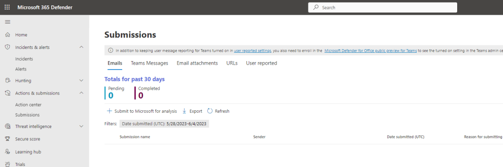 1.) Login to the Microsoft 365 Defender Portal and under Actions and Submissions select Submissions
