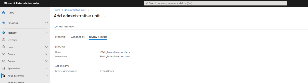 Our job here is done. A Restricted Management Administrative Unit has been set up and ensures that Megan Bowen is the only administrator who can make licencing changes to those who currently have Teams Premium Licences, even when other administrators have Microsoft Entra ID roles such as Licence Administrator or Global Administrator.