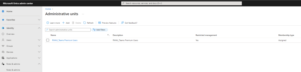 This week I’ve been asked what I think about the rebranding of Azure AD to Microsoft Entra ID. Is it something which I would consider significant? Is it something I think occurred because, for example, some marketers in Redmond have nothing better to do? Let’s consider that a moment. In recent years, Microsoft has executed multiple large-scale rebrands. Office 365 to Microsoft 365. Azure to Microsoft Azure. The Security stack aligned under Defender, whilst Compliance is amalgamated under Purview. So my thinking goes that the rebranding of Azure AD was only ever a matter of time; that it was only ever going to go one way given how Microsoft Entra became the brand for Microsoft’s Identity services. If one thing, all these cases illustrate that Microsoft is not beholden to names or brands whether these are historical or popular, or where they’ve become embedded in the day-to-day language of the very organisations and communities that use them. And this was demonstrated again last week – with not so much fanfare – when they also announced that it was ditching it’s default Calibri font in favour of the newly developed Aptos. But then Microsoft is a technology business after all. It’s mantra is that change and innovation is constant. This leads onto point two. There are things that drive change and innovations other than technology. We as technologists can lose sight that Microsoft is first and foremost – when everything is stripped away – a sales-led techonology business. Sometimes we don’t perceive or appreciate the value of changing it up, because it’s not our role to give these products fresh impetus, or drive astronomical numbers in a given area, or reduce a products value and everything it does to a singlular name. I think the rebrand makes absolute sense given Microsoft’s plans are for Security, Compliance and Identity. Consistency across the range. An easier conversation for commercial. A broader and more robust terminology which allows the addition of more products such as what we saw given the Security Service Edge (SSE). It may just be me but it feels more unified yet clear cut and distinct from other parts. I also think it’s a savvy move to take Azure – the platform – out the name. But don’t get me wrong here. Many of us are going to have to swallow pain, especially we who create or maintain content or teach. And yes – it’s sad too in that it feels like an instituion is ending. But let’s look forward with gusto. It’s not the last one of these we’ll be doing. Change is constant. This blog is on the new Restricted Management Administrative Units capability now in preview in Microsoft Entra ID. You can now designate specific users, security groups, or devices in your Microsoft Entra ID tenant that you want to protect from modification by tenant-level administrators. Obviously this has benefits in certain scenarios – typically larger orgs, where administration is based on geos. And we need to understand that at this preview stage this is based on Microsoft Entra ID actions such as modifying users and licences, not management of the services themselves. In Teams world, I am going to apply a use case of managing users with Teams Premium Licencing