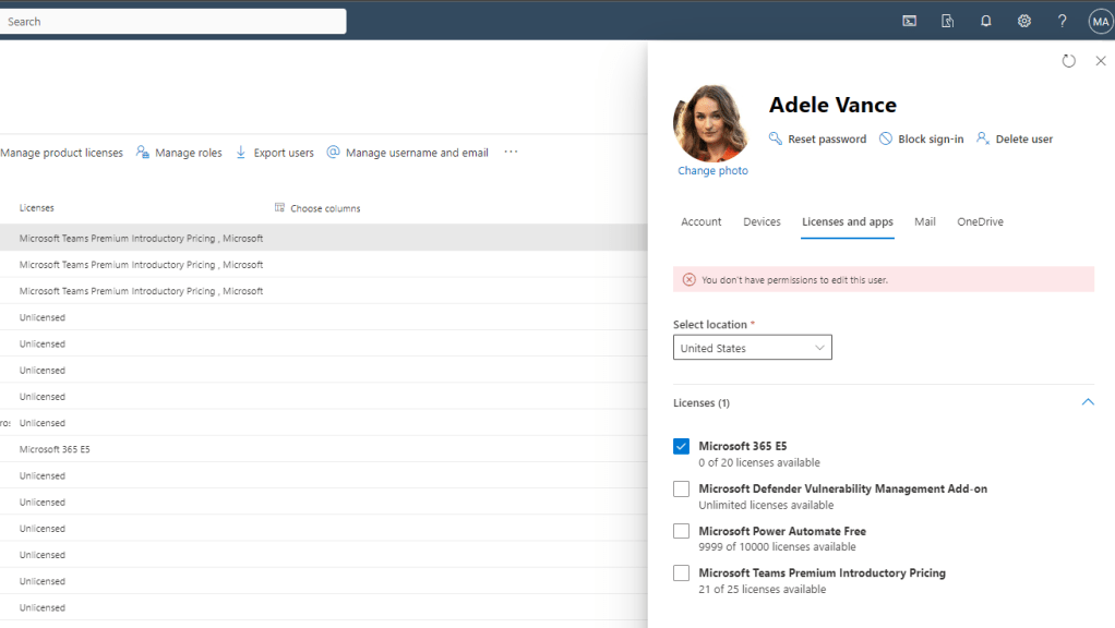 In Microsoft Entra ID, I cannot remove the licence either, nor in PowerShell