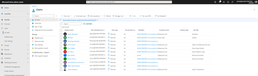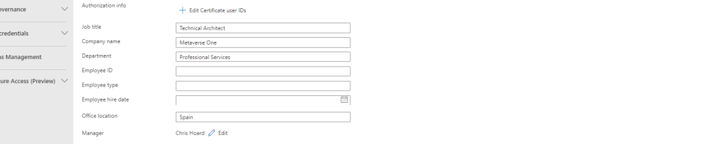 1.) The first thing to do is ensure the data is correct in Microsoft Entra ID. These users properties are then configured in the Microsoft Entra Admin Centre by an administrator via Users then All Users and then selecting each user and editing their properties. Here the following properties set on each user per the tables above: