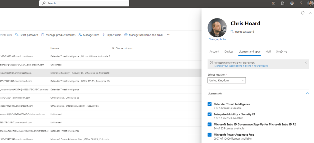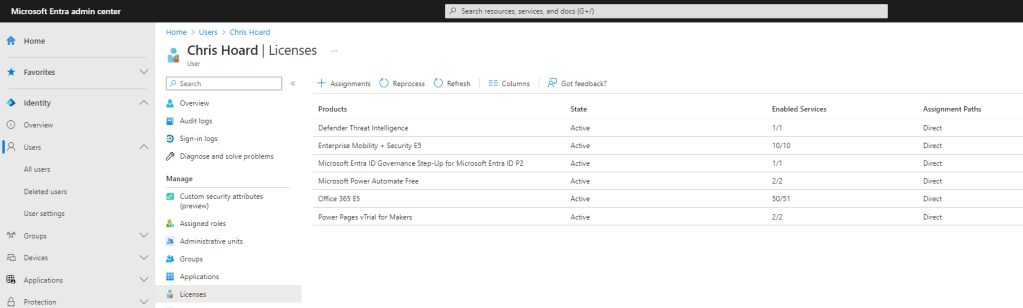 3.) Finally before an access review is set up on the Team, we need to ensure that the reviewer is correctly licenced. This can be done either through the Entra Admin Centre or through the Microsoft 365 Admin Centre. The Team Owner Chris Hoard will perform the access review and therefore should have the Microsoft Entra ID Governance SKU or Step Up SKU for Entra ID P2 licence assigned. This example uses the Step Up SKU. A full purchase or a trial can be used.