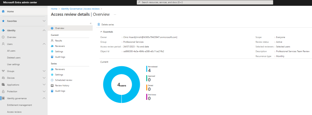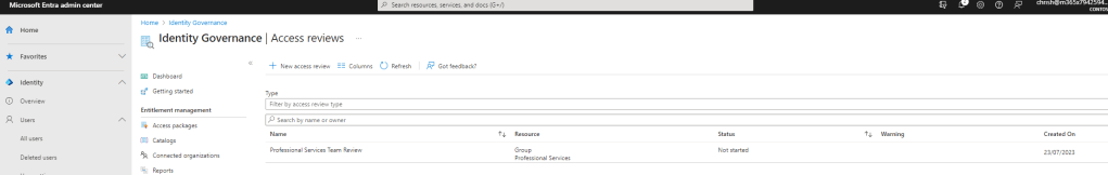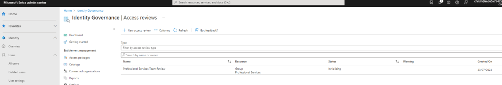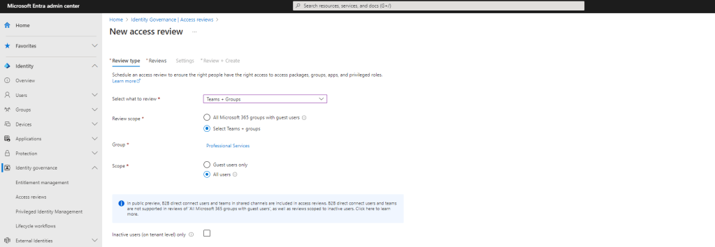 Once done select Reviews. Note – Inactive Users is another new functionality added to Entra which I’ll likely blog about at a later date but am not using it here since the scenario applies to both active and non-active users