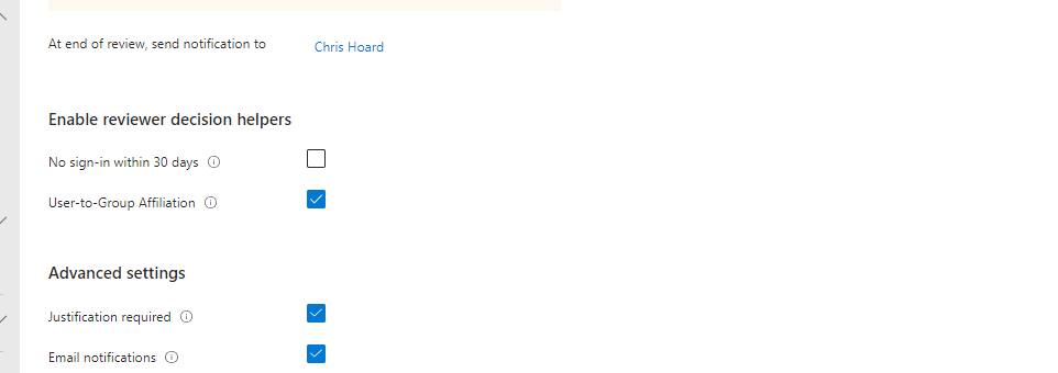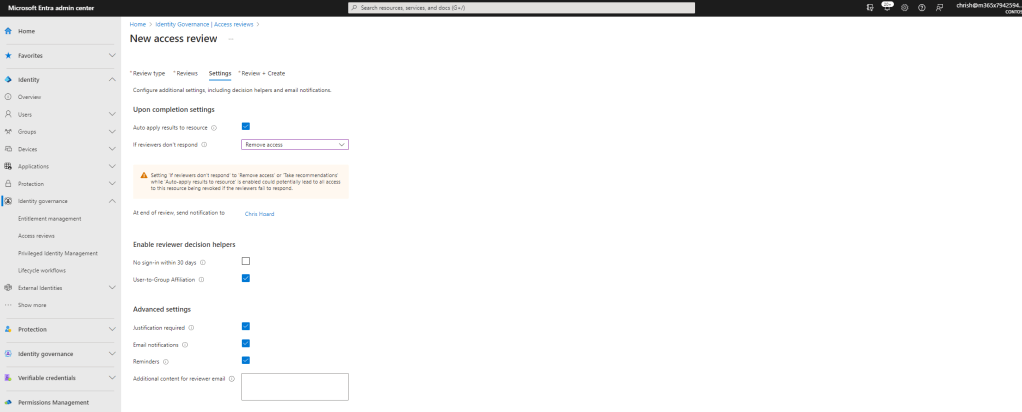 5.) Finally the rules for the Access Reviw are set, and importantly, this is where User-to-Group Affiliation is set. In this example, the access review will be auto applied and if the reviewer (Chris Hoard) doesn’t respond in that within the 3 day window of the review, the members are automatically removed from the Team. This example review is configured as follows: