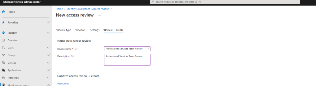 6.) Set a Name and Description for the access review – here called Professional Services Team Review – and select Create